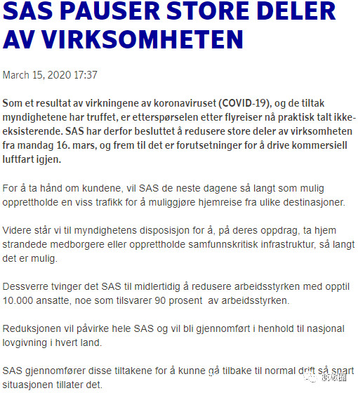 7、北歐航空宣佈自3月16日起取消大部分航班,同時暫時裁員(原文直譯,或為強制無薪休假)約10000人,約為員工總數的90%。