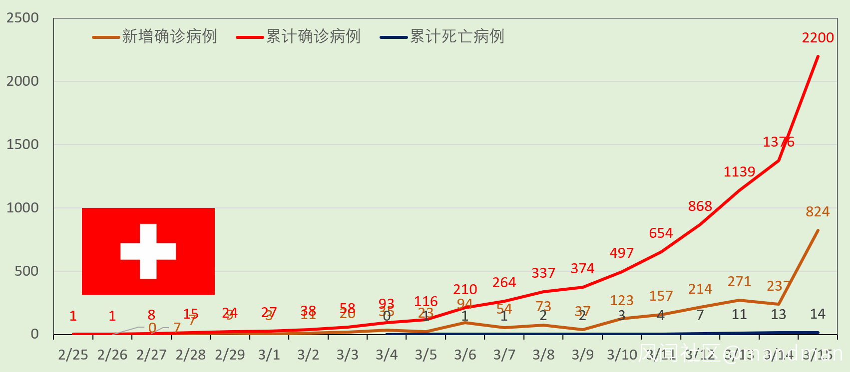 **瑞士:**新增病例數為824例,環比暴漲248%;累計2200例,環比增加60%;百萬人口確診率為259,僅次於意大利,名列全球第二;新增死亡1例,累計死亡14例。瑞士抗疫形勢迅速惡化。