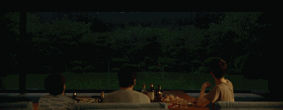 基宇一家模仿主人,隔着巨大的落地窗欣賞雨電交加的夜晚。