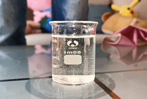 讓我們拉近看一下效果:微量的小氣泡在淺黃色的溶液中緩慢上升、溢出