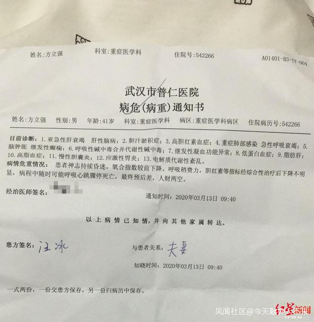 2月28日,因看到普仁醫院發佈可住院信息,我丈夫終於被該院收治。就在我以為終於等到希望的時候,當天就收到醫院出具的病危通知書,即告知其醫院條件有限,要求我們儘快轉院至大醫院治療。