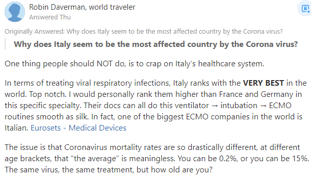 在治療病毒性呼吸道感染方面,意大利位居世界前列。我個人認為他們在這方面比法國和德國都要強。他們的醫生都可以做呼吸機→插管→ECMO程序並且順滑如絲。事實上,世界上最大的ECMO公司之一是意大利公司。歐洲標準-醫療器械