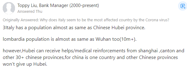 然而,湖北可以從上海、廣東和其他30多箇中國省份獲得幫助/醫療援助,因為中國是一個(整體)國家,其他中國省份不會放棄湖北。