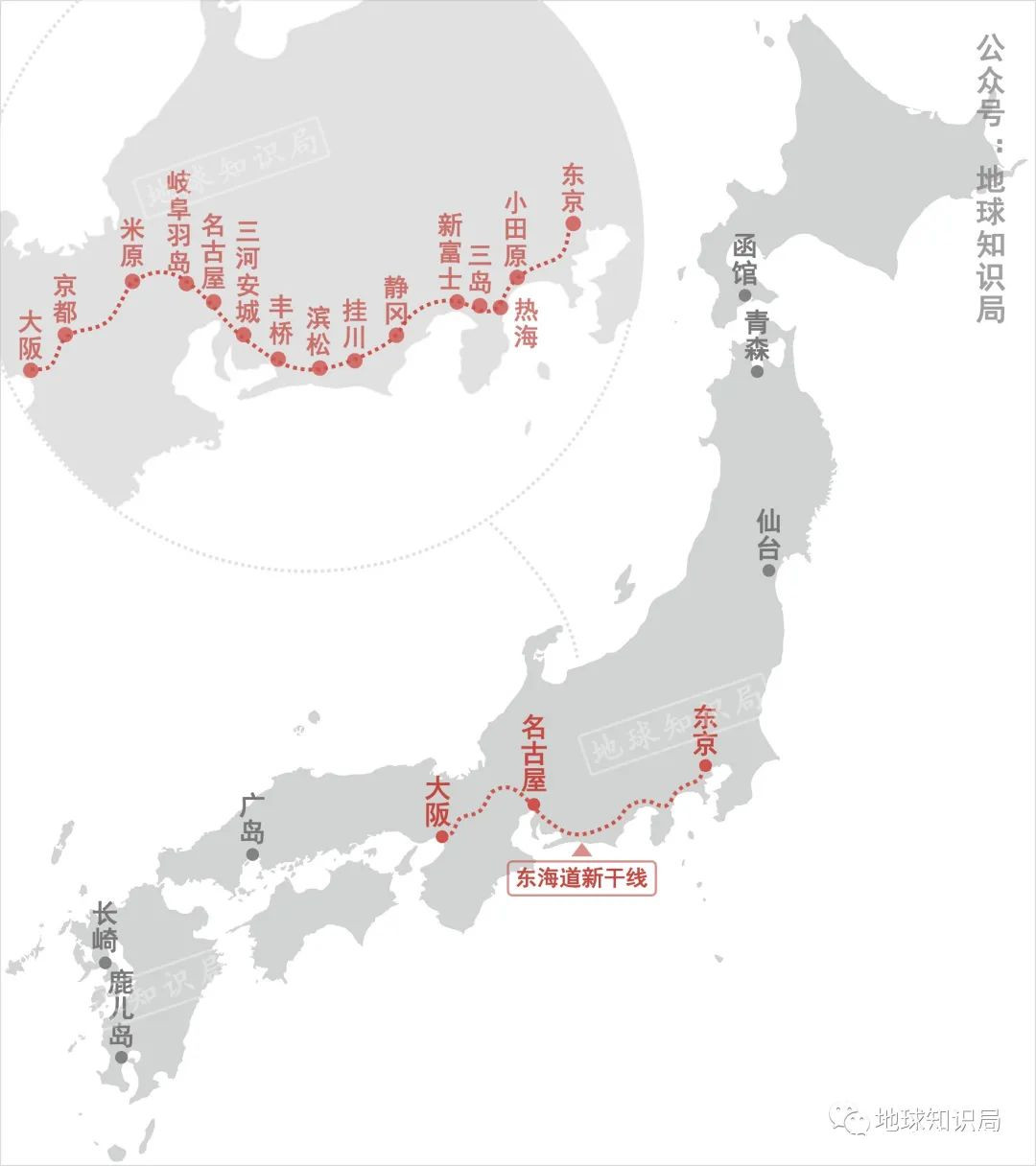 但是我們可以看到,東海道新幹線,為了繞開富士山、赤石山脈、木增山脈的同時,滿足沿線沿線靜岡、滋賀等縣沿線乘客的出行需要,線路出現了一個拐向北,一個拐向南的大彎,這使得東海道新幹線比東京到大阪間的直線距離多了100多公里。而日本其他新幹線線路亦有這樣的規劃建設侷限。