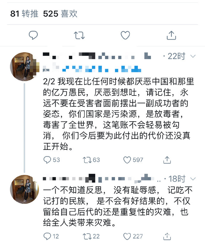 微博網友柳佳衣:美國疫情爆發中國疫情控制住。讓每天在朋友圈秀美國優越感的二鬼子們發瘋了?我們有什麼錯?我們中國才是受害者