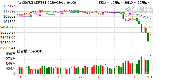 繼9日觸發熔斷之後,巴西股市10日回調7.14%。不過,世界衞生組織11日宣佈新冠肺炎疫情為“大流行”級別,投資者信心再次受到重創,當天博維斯帕股指迅速下跌10.11%,觸發當週第二次熔斷。頹勢延續至次日,12日開盤後,股市一天內兩次觸發熔斷機制。當天,巴西股市以72582點收盤,跌幅達14.78%,創下1998年來單日最大跌幅。