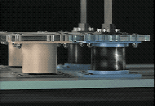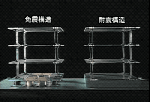 隔震支座有多好用呢?大家看一下日本免震構造協會的演示就清楚了。左邊的建築模型採用了隔震支座,右側的建築模型僅僅採用了普通的防震材料——