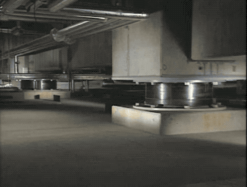 這種在地基上設置隔震支座的基礎隔震技術最初是新西蘭建築師 Bill Robinson 在20世紀70年代提出的,而這種橡膠金屬交疊的隔震支座也是他發明的。