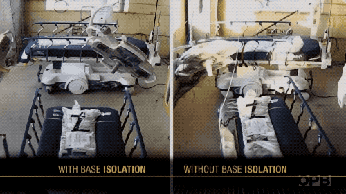即使四處的地面都搖晃得厲害,隔震支座也能讓上方建築不動如山——