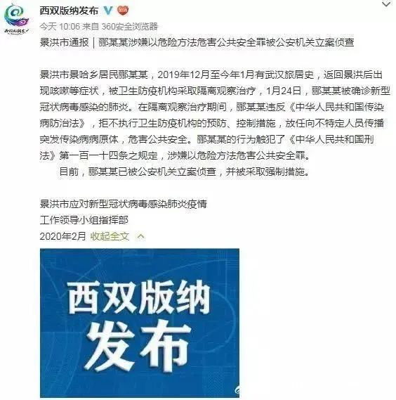 1月22日,在雲南西雙版納景洪市,曾旅居湖北武漢的酈某某出現咳嗽等症狀,被120急救車轉運至西雙版納傳染病院隔離。酈某某趁醫務人員處置其他病人時逃離醫院。當地衞健和公安部門多方調查,確定患者已到其妹妹在景洪市某小區的家中。