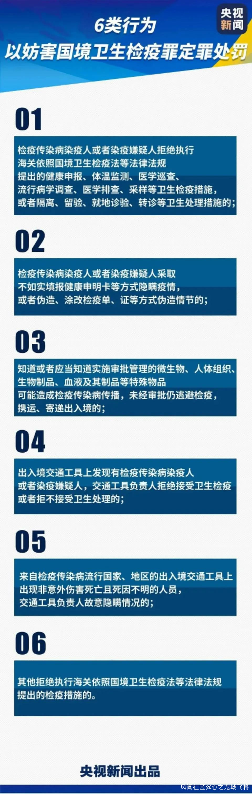 同一天,最高人民法院、最高人民檢察院、公安部、司法部、海關總署聯合發佈《關於進一步加強國境衞生檢疫工作依法懲治妨害國境衞生檢疫違法犯罪的意見》。實施六類妨害國境衞生檢疫行為,如果引起鼠疫、霍亂、黃熱病以及新冠肺炎等國務院確定和公佈的其他檢疫傳染病傳播或者有傳播嚴重危險的,將依照刑法第三百三十二條規定,以妨害國境衞生檢疫罪定罪處罰。