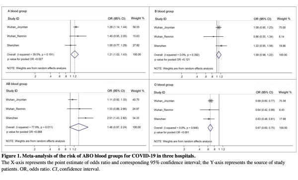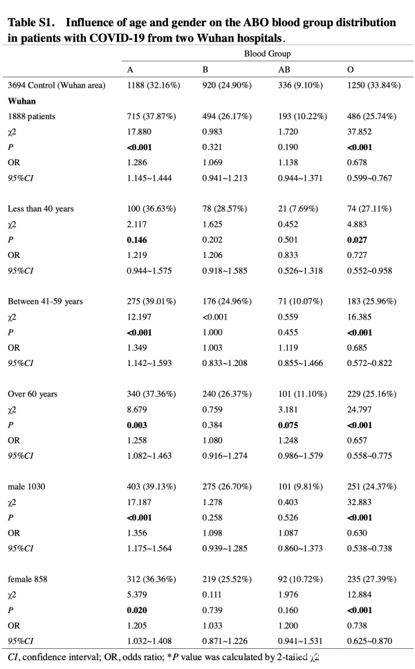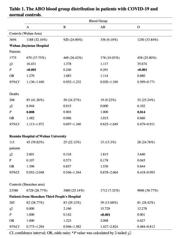 武漢市3694名正常人的ABO血型分別顯示A、B、AB和O型血型的百分比分佈分別為32.16%、24.90%、9.10%和33.84%,而武漢市金銀潭醫院的1775名COVID-19患者顯示A、B、AB和O型血型的ABO分佈分別為37.75%、26.42%、10.03%和25.80%。