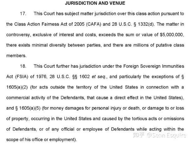 起訴文書中認為根據 美國2005年《集體訴訟公平法案》(CAFA)與美國法典第28章 司法制度和司法程序 第1332條 D款,該法院享有該案件的管轄權。