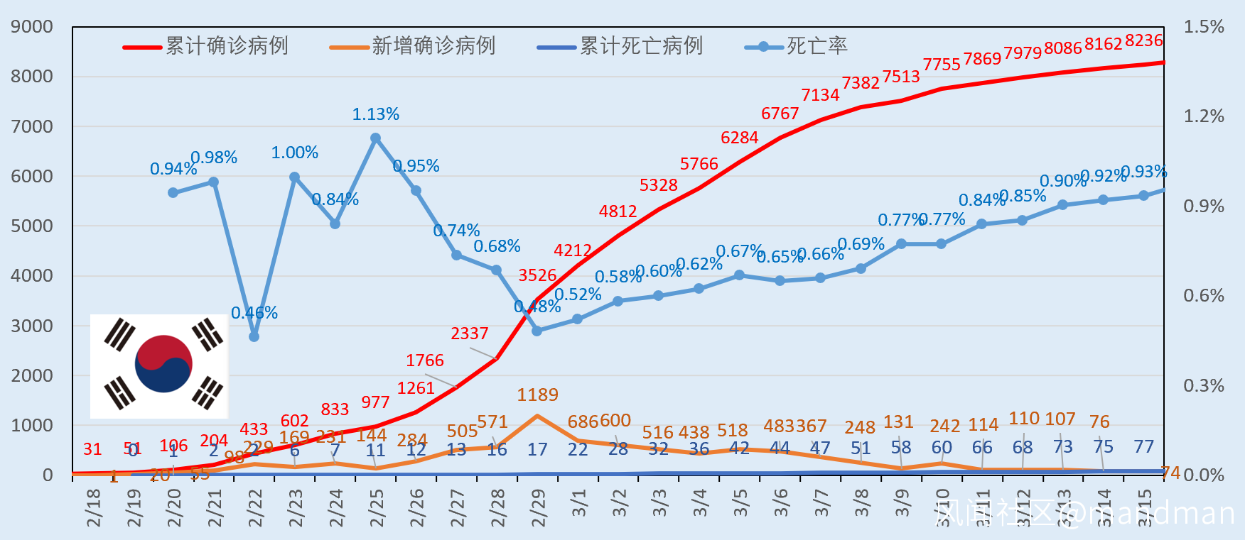 **韓國:**新增確診病例84例,連續第三天低於100例,累計確診8320例,百萬人口確診率為161;病亡增加4例,累計81例,百萬人口死亡率為1.57,病亡率為0.97%。韓國疫情整體控制得不錯,應檢盡檢,檢測的病例數僅次於中國,確診病例低速增加,死亡病例緩慢增加,顯示抗疫工作的有效性。