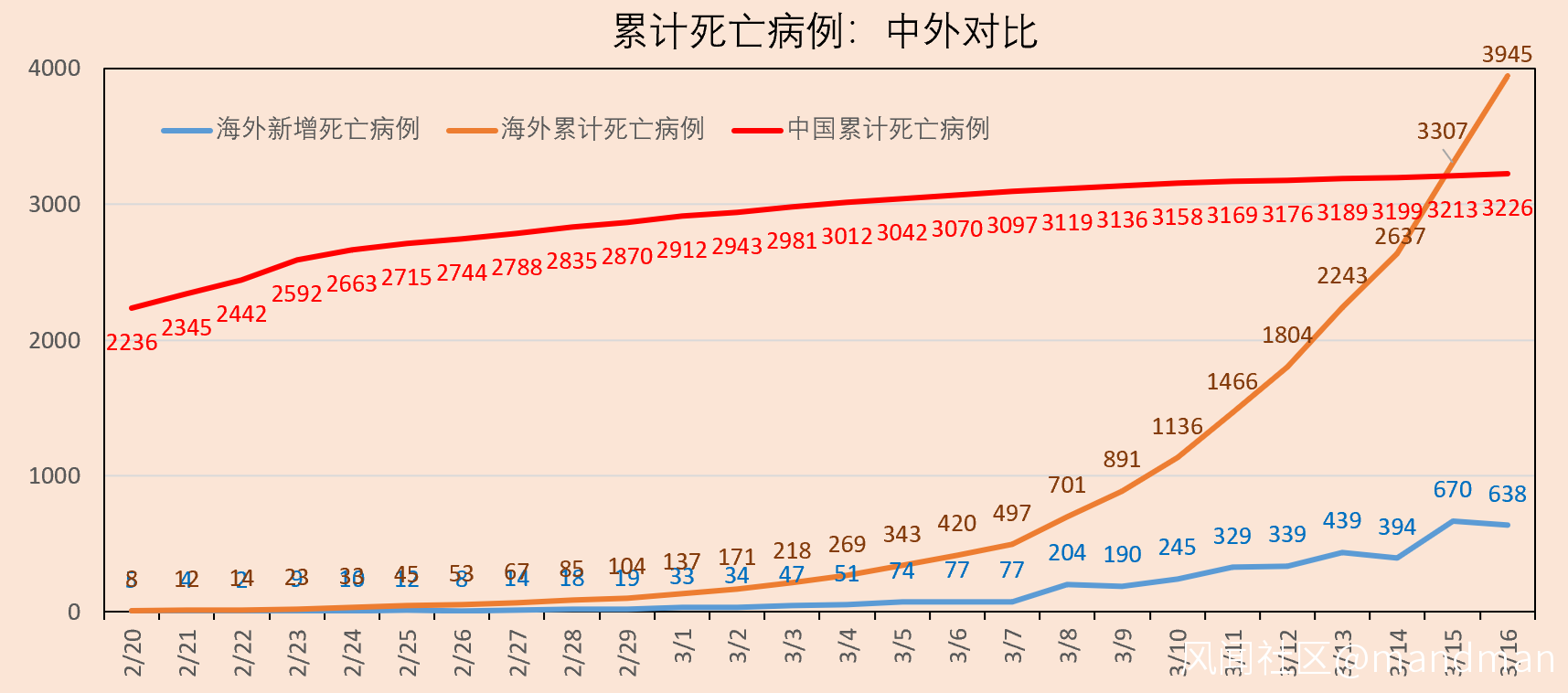 歐洲的意大利確診病例數繼續快速增加,累計病例已接近28000例,累計死亡病例突破1800例,均位列全球第二,病亡率高居全球之首,當地醫療體系全面崩潰,醫院被迫根據患者的預期壽命進行選擇性收治;受意大利疫情影響,德國、法國、西班牙、瑞士、英國、挪威、荷蘭、瑞典、丹麥等歐洲多國的疫情迅速發展;由於人口的自由流動,歐盟的抗疫形勢極端嚴峻、複雜;英國採取“羣體免疫”的政策被動應對,不但危害本國民眾,還威脅全球抗疫大業;英國、瑞典、挪威的數據有瞞報之嫌。美國病例迅速增加、突破4700例,全美49個州均出現新增病例,社區羣體性感染不斷髮生,新增病例預計將出現爆發性增長。