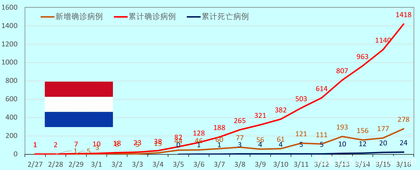 **荷蘭:**新增278例,前三天為193、156、177例,呈快速增加態勢,累計1418例,百萬人口確診率為82;新增死亡4例,累計24例,死亡率為1.7%。