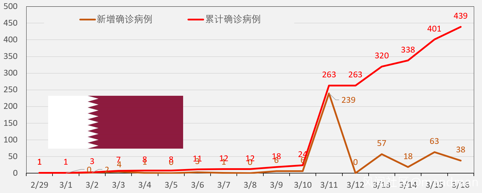 **卡塔爾:**新增38例,累計439例,百萬人口確診率為169。