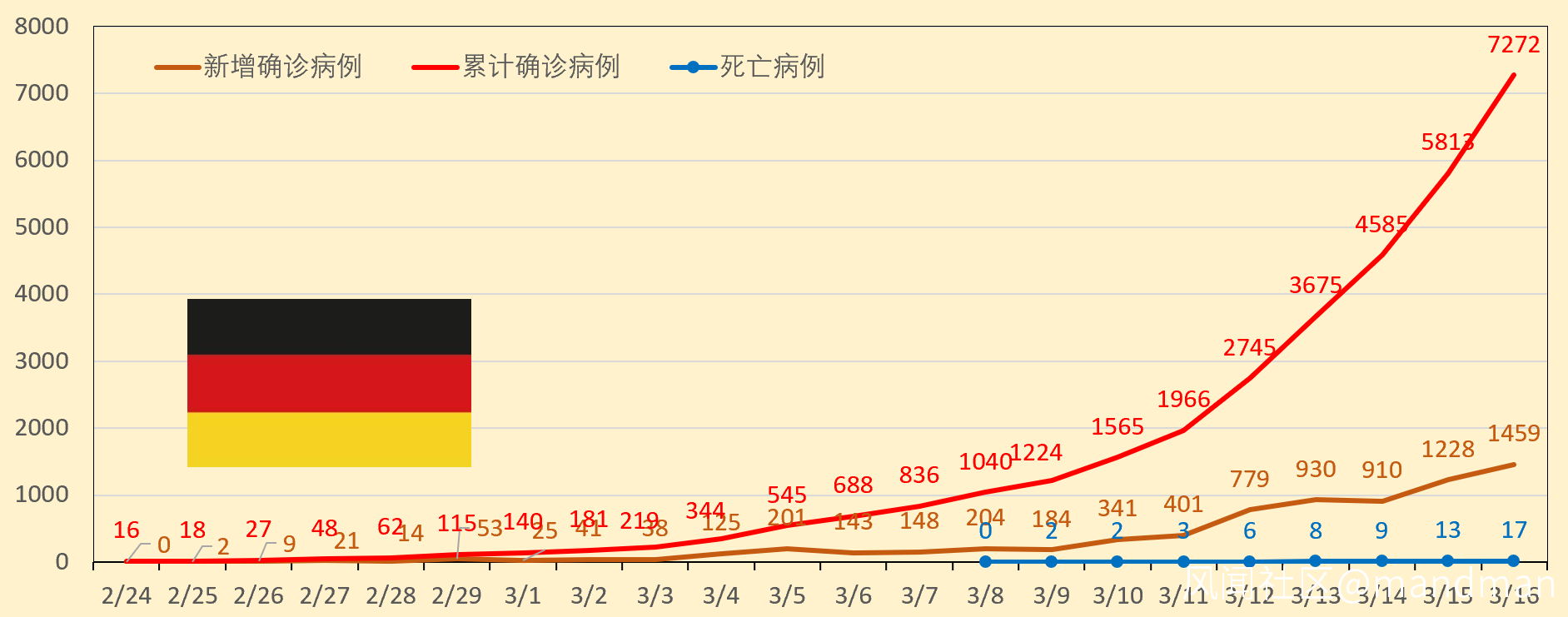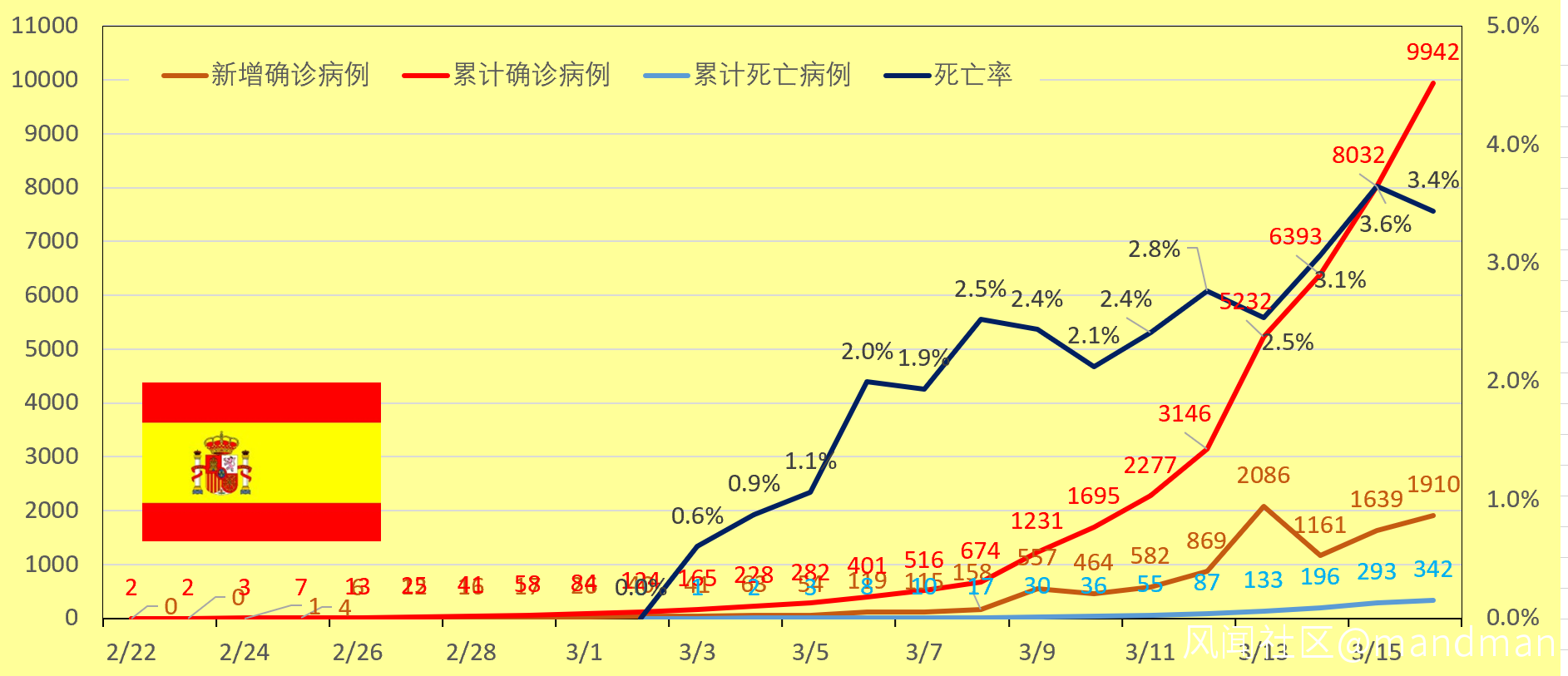 **西班牙:**新增病例數為1910例,環比增加17%;累計確診9942例,逼近1萬例大關,環比增加24%,百萬人口確診率為213;新增死亡病例49例,累計342例,百萬人口死亡率為7.3;病亡率為3.4%。西班牙確診人數、死亡人數增速驚人,眼看着往意大利的道路上狂奔,西班牙政府已經宣佈限制人員自由流動,關閉全國商鋪,並且向中國政府正式求援。中國政府已經緊急提供了一批醫療物資援助,並開放了相關的商業渠道。