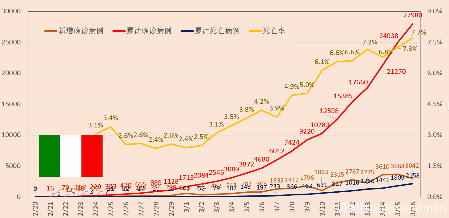 **意大利:**疫情繼續發展, 截止當地時間16日24點,單日新增3042例,環比減少626例,累計確診27980例,環比增加12%;百萬人口確診率為463,高居全球百萬以上人口國家之首;病亡增加339例,累計死亡2158例,百萬人口死亡率為36;累計確診病例和病亡病例均位列全球第二,僅次於中國;病亡率高達7.7%,高居全球之首。迫於疫情壓力,意大利政府緊急對全境進行封鎖,醫療體系已經崩潰,醫院被迫選擇性收治患者,如果歐盟國家不能及時提供援助,意大利的國運堪憂。