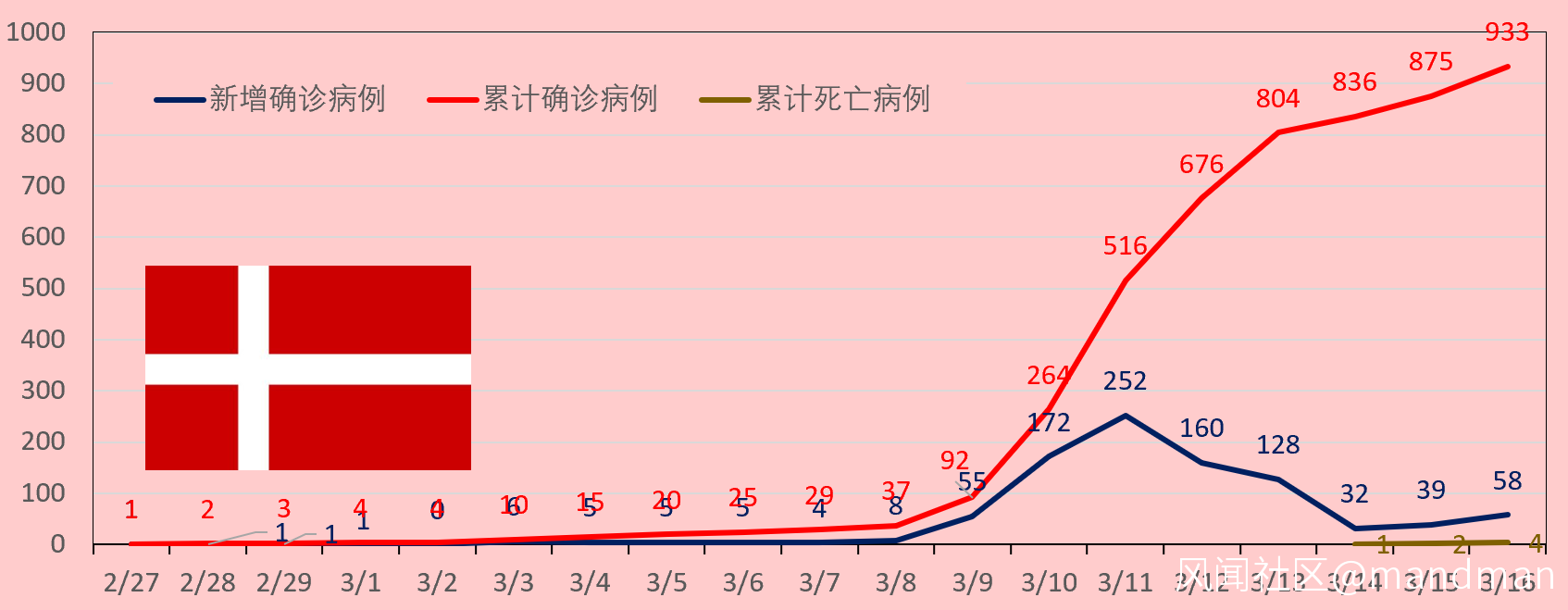 **丹麥:**新增58例,前三天為32、39、58例,累計933例,百萬人口確診率為161;新增病亡2例,累計4例。丹麥的新增病例以3月11日為界,之後放棄對輕症患者的檢測,因此數量暴跌;但近三天重症患者和死亡的例數又開始增加,按輕重症1:4的比例,丹麥實際增加300例以上;畢竟,病毒傳播的基本規律無法違背。