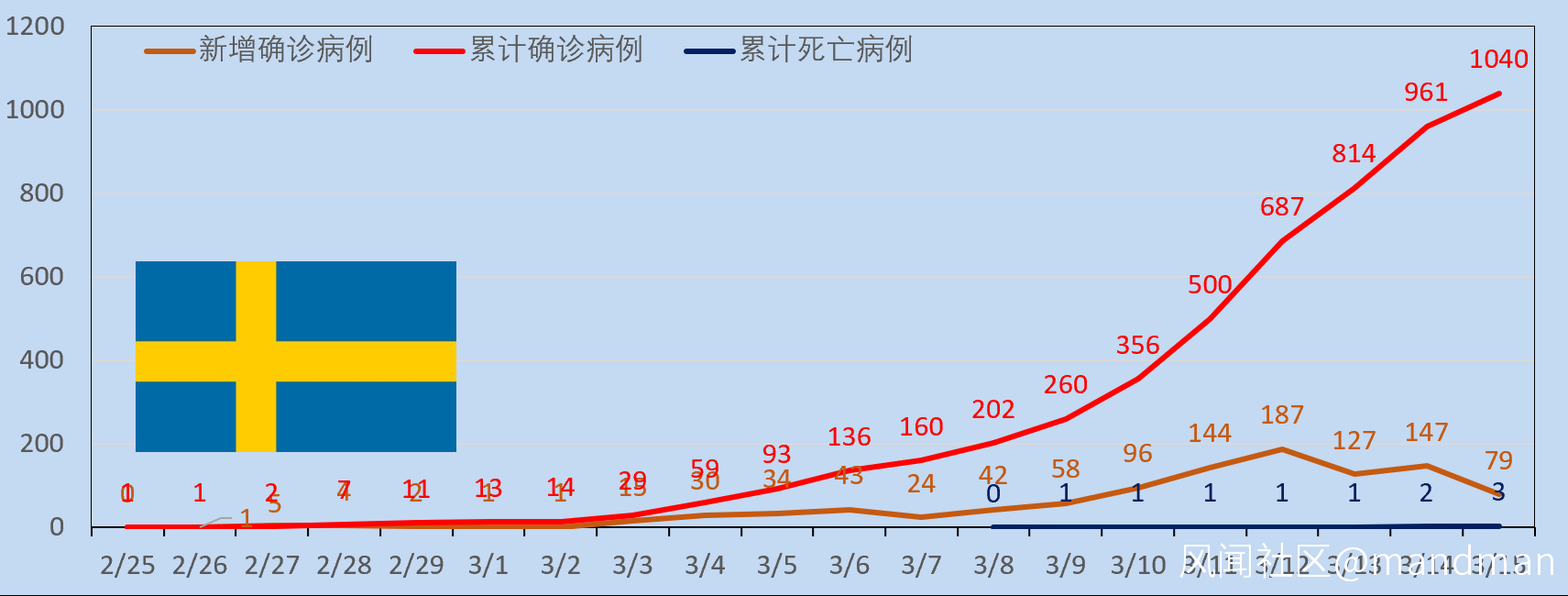 **瑞典:**新增89例,前三天為127、147、71例,數據可疑,累計1121例,百萬人口確診率為110;新增死亡病例4例,累計7例。 瑞典的新增病例數據有瞞報之嫌。