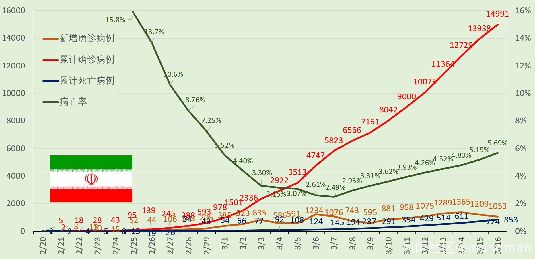 **伊朗:**新增確診病例1053例,環比連續第二天減少,累計14991例,百萬人口確診率為183;新增死亡病例129例,累計853例,百萬人口死亡率為10.4,病亡率為5.69%。新增病例環比開始下降,顯示全國大排查起到了初步效果,但新增死亡病例、病亡率繼續上升,後續對重症患者的治療、減少病亡是一項十分艱鉅的任務。