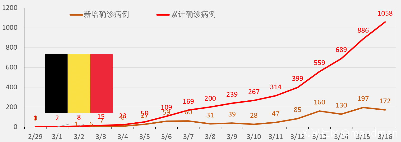 **比利時:**新增172例,前三天為160、130、197例,快速增加,累計1058例,百萬人口確診率為93;新增死亡病例6例,累計10例。