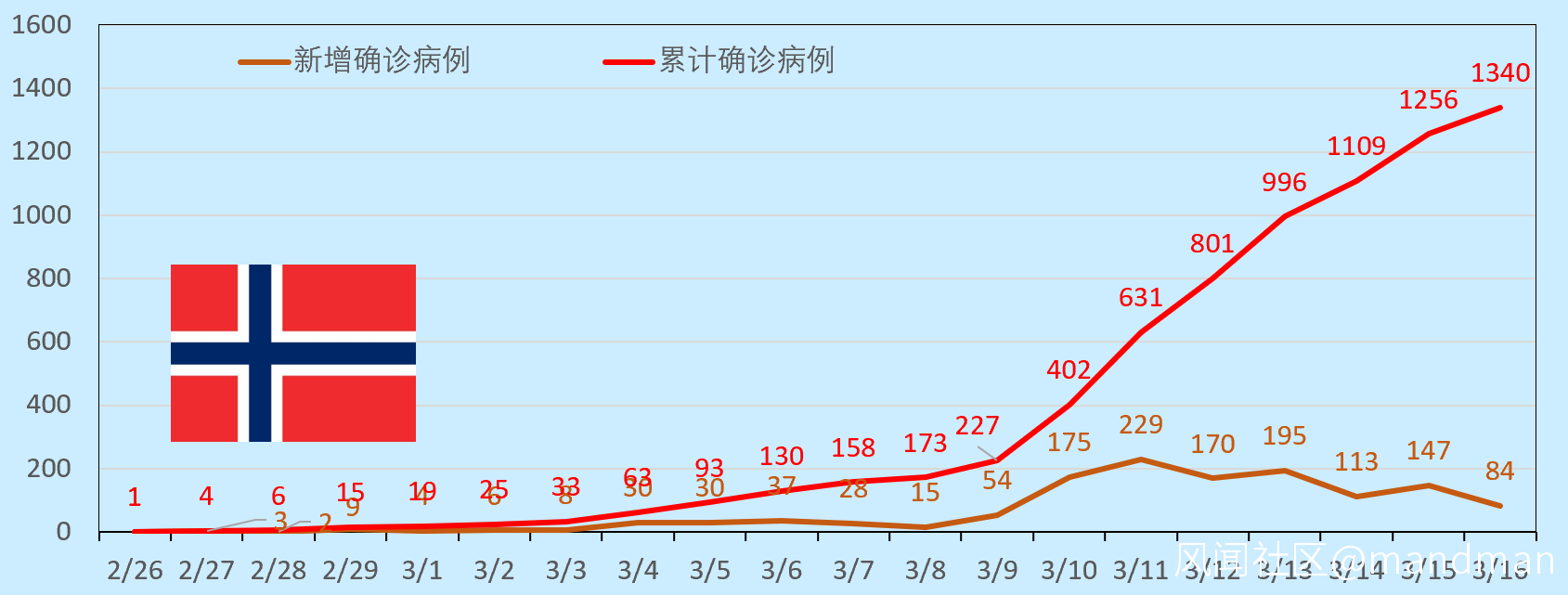**挪威:**新增84例,前三天為195、113、147例,數據可疑,累計1340例,百萬人口確診率為252,僅次於意大利、瑞士。挪威的新增病例數據有瞞報之嫌。