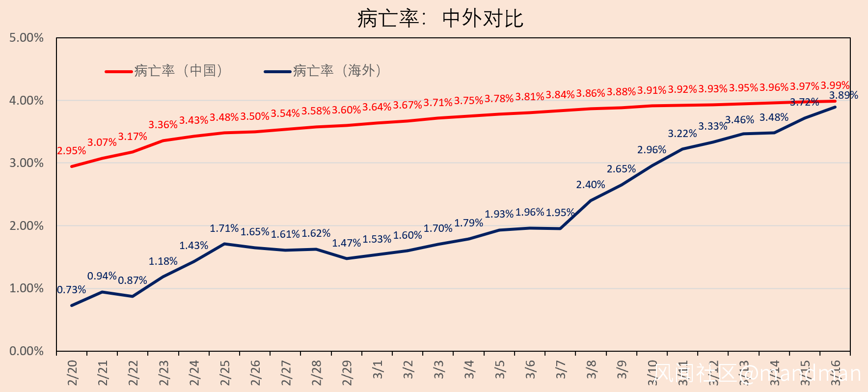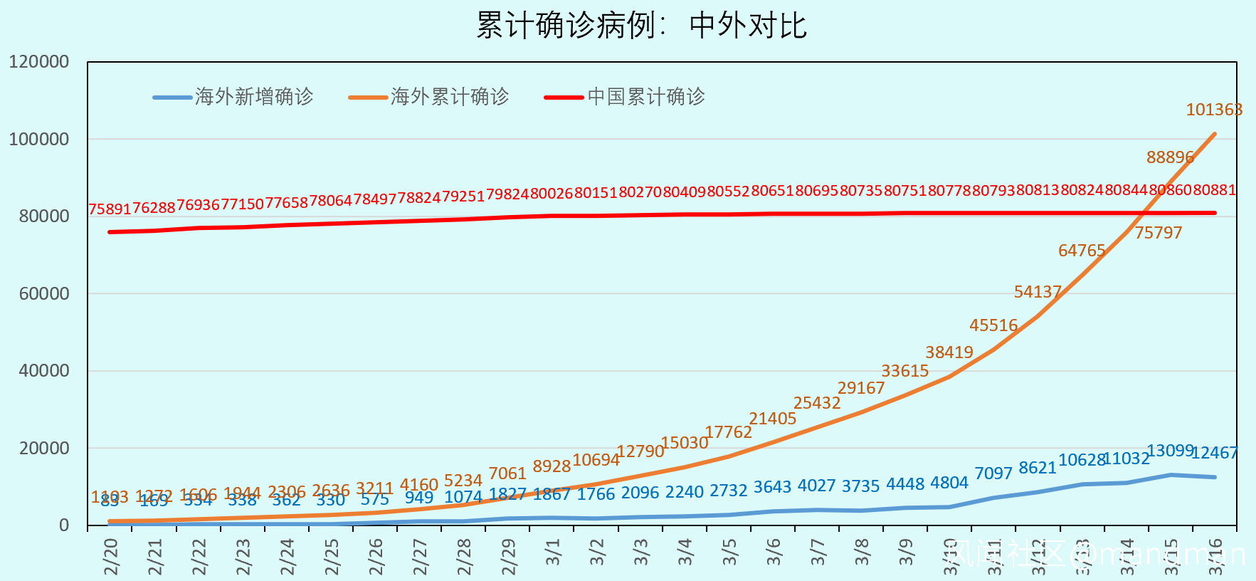 3月16日,全球(除中國)新增確診12467例,連續第四天超過1萬例;累計確診101363例,首次突破10萬例大關,環比增加14%,是中國的1.25倍;新增病亡638例,病亡累計3945例,是中國的1.22倍;粗病亡率3.89%,比中國低0.1個百分點,預計明天就能實現病亡率的反超;新冠肺炎已經蔓延到全球141個國家,比前一天增加5個。