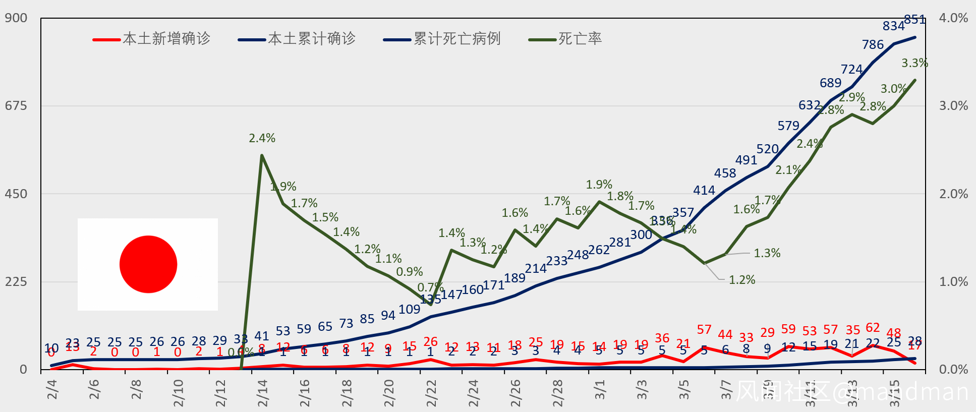 **日本:**鑽石公主號確診697例,死亡7例;國內新增確診病例17例,累計確診851例,百萬人口確診率為6.7;新增病亡3例,累計28例,百萬人口死亡率為0.22,病亡率為3.3%。日本為了奧運,在數據上做盡文章,恐怕是竹籃打水一場空。期待取消奧運後,日本數據暴漲的日子。