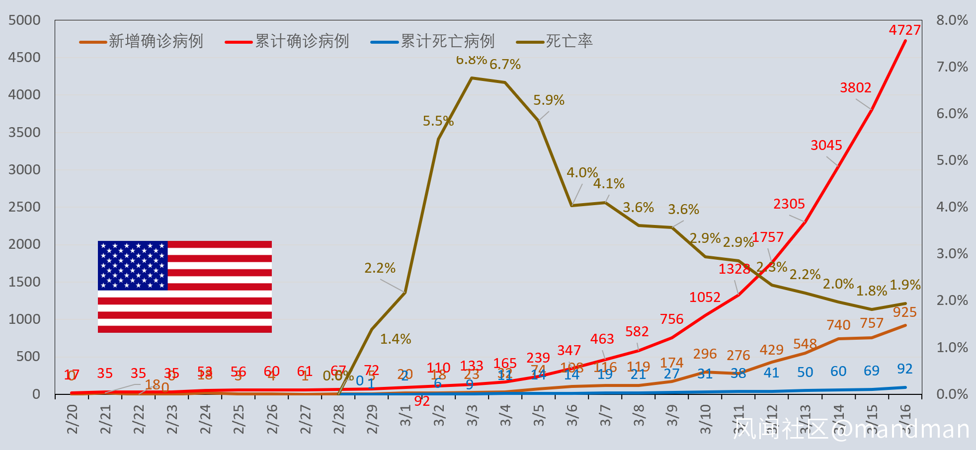**美國:**新增925例,逼近千例大關,環比增加22%,前三天為547、740、757例,呈迅猛增加態勢,累計4727例,環比增加24%;百萬人口確診為14.5;新增病亡23例,累計92例,病亡率為1.9%。由於疫情嚴重,美國多地宣佈封城。美國的病例檢測嚴重不足,確診病例嚴重低估,預計美國後續的確診病例將出現持續爆發性增長。由於疫情失控,大統領瘋狂甩鍋,使出了種族主義的卑劣手段,令人憤慨。