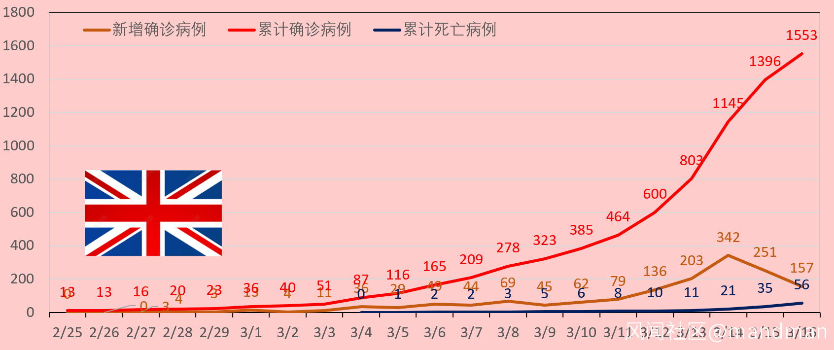 英國:“羣體免疫”大法果然威力無窮,新增157例,連續第二天減少,前三天為203、342、251例,累計1553例,環比增長11%;百萬人口確診率為23;新增死亡病例21例,累計56例,死亡率3.6%。英國的病例數嚴重偏低,新增確診病例連續下降,嚴重不符合傳染病規律,死亡率卻已經明顯上升,超過了西班牙。 “羣體免疫”政策害人害己,後患無窮。