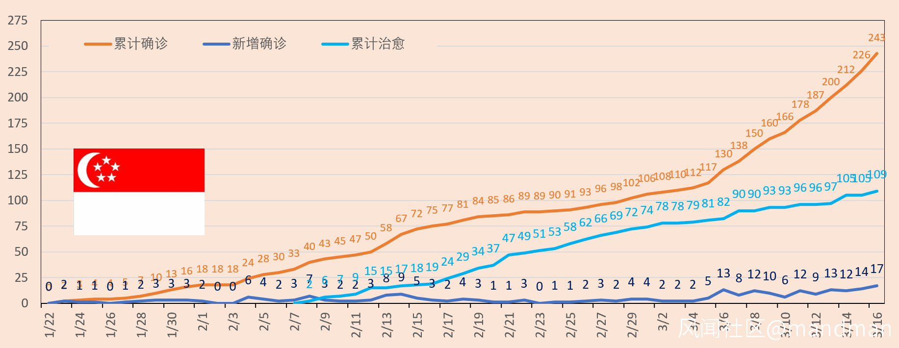 **新加坡:**新增17例,其中境外輸入11例,累計確診243例,百萬人口確診率為43;累計出院109例;目前住院病例134例,創了新高;重症患者13例。在嚴密防控下,新加坡的病例數繼續小步增加,境外輸入日益成為新加坡不可承受之重。