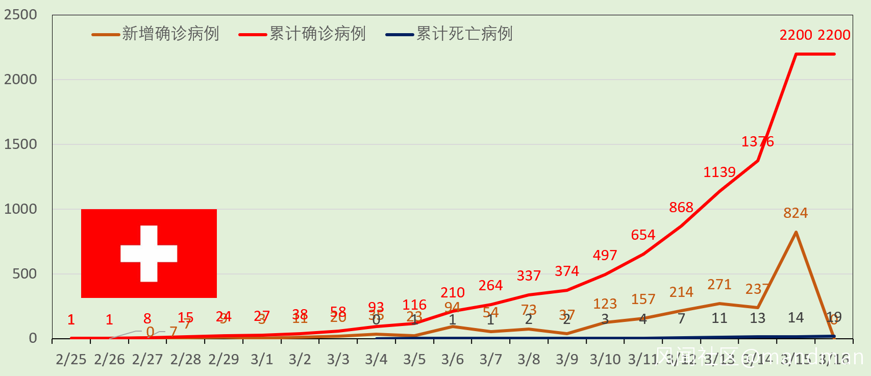 **瑞士:**沒有新增病例;累計2200例,環比增加60%;百萬人口確診率為259,僅次於意大利,名列全球第二;新增死亡5例,累計死亡19例。