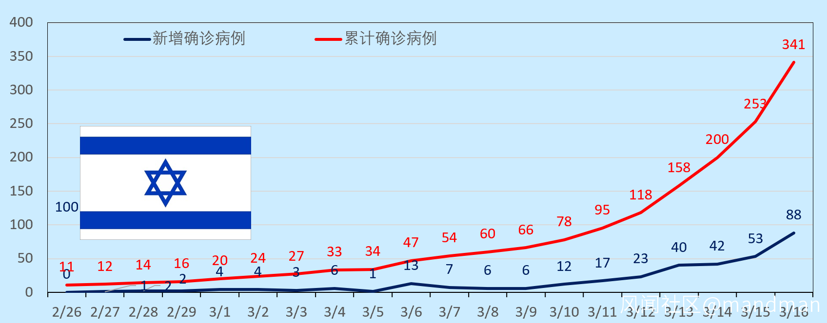 以色列:新增85例,累計295例,百萬人口確診率為33。