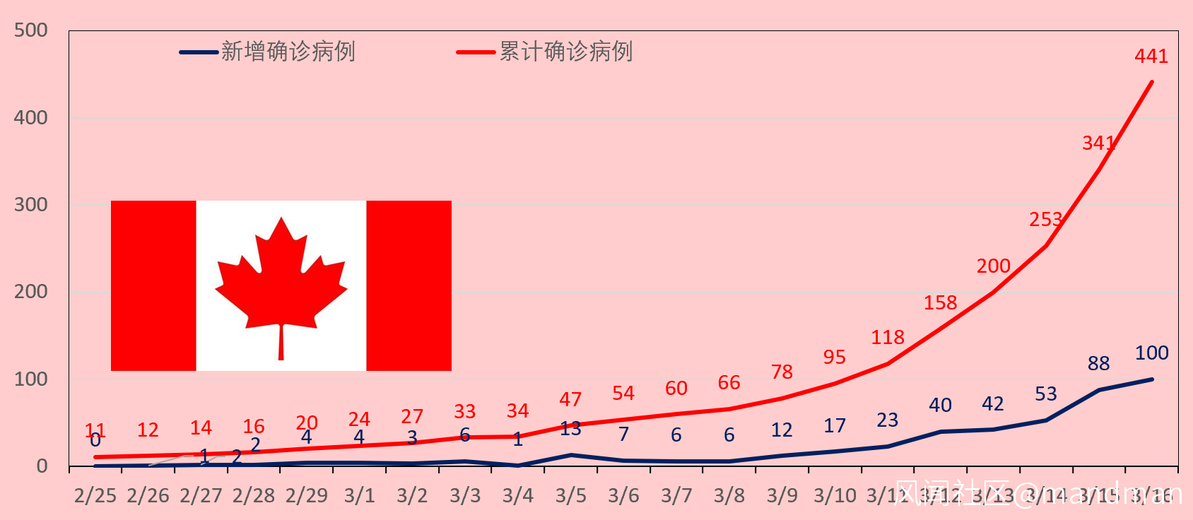 **加拿大:**新增100例,前三天為42、53、88例,呈快速增加態勢,累計441例,環比增加29%;百萬人口確診為12,疫情尚處於早期起步階段。