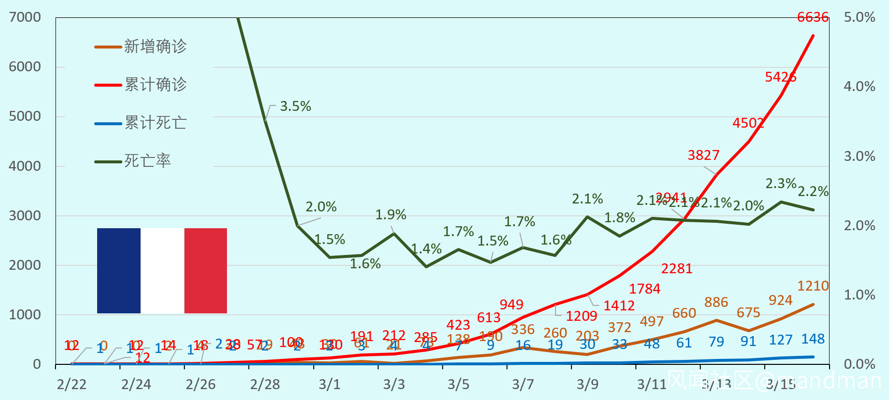 **法國:**新增病例數為1210例,環比增加31%;累計確診6636例,環比增加22%;百萬人口確診率為99;新增病亡21例,累計148例,百萬人口死亡率為2.2;病亡率2.2%。法國已經有兩位部長級高管確診,抗疫形勢迅速惡化。