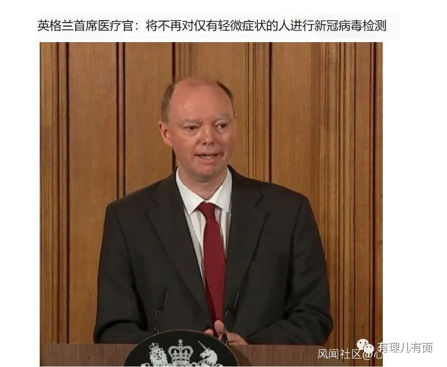 英國知道對於疫情的蔓延已經沒有更好的辦法來控制,於是準備讓自己的國民遵循大自然“優勝劣汰”法則,通過“羣體免疫”來應對病毒,免疫力不行的就死,凡不死者就自帶抗體。這種自暴自棄倒退回“原始社會”的模式,不就是草菅人命嗎?而英國首席醫療官惠提(Chris Whitty)居然説,將不再對僅有輕微症狀的人進行新冠病毒檢測……這麼掩耳盜鈴真的是讓有理哥醉了。