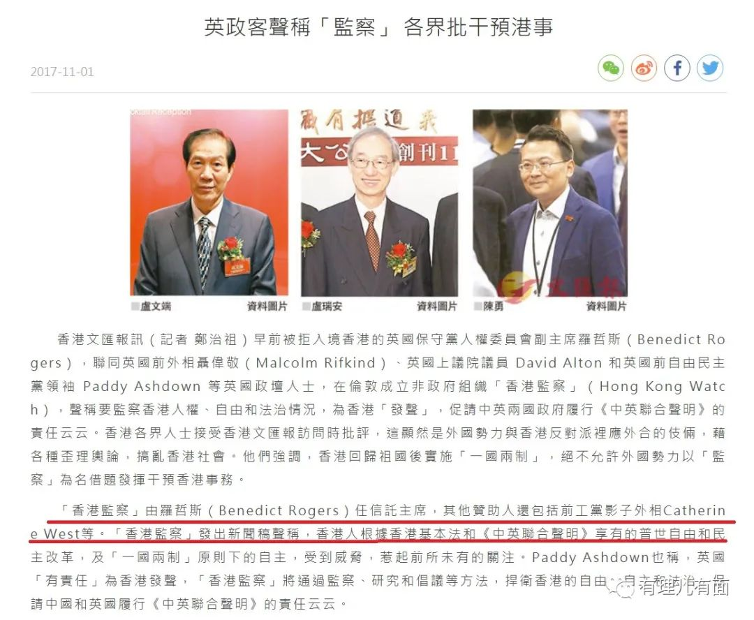 講到這,還要説説這個卡邁克爾議員,他還有個身份,就是英國非政府反華組織 “香港監察”的贊助人。有理哥講過多次美國NGO組織“香港人權觀察”,這個只有兩字之差的“香港監察”卻是貨真價實的英國的NGO組織。別看它名字裏有“監察”二字,究其實質,不過是偽民主、真禍害罷了。