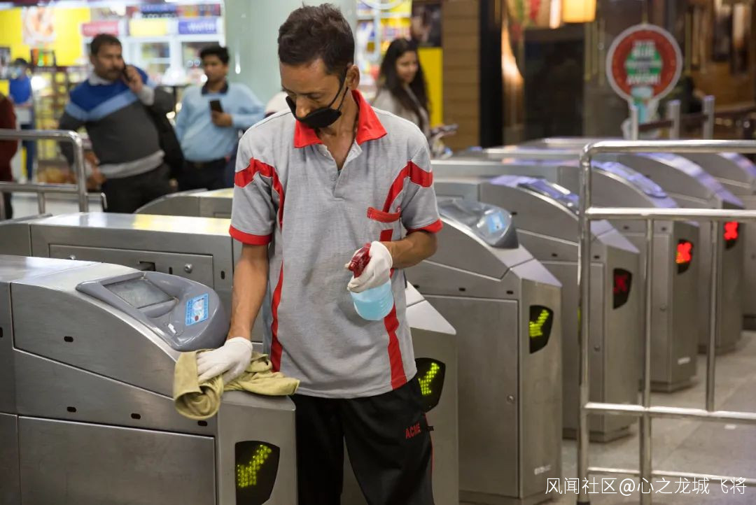 3月13日,印度新德里,一名工作人員在地鐵站內進行消毒防疫