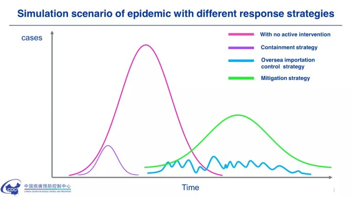 圖表顯示:在圍堵干預策略下,曲線平穩走低,只有在無干預狀態下,病情傳播曲線才會陡然升高;