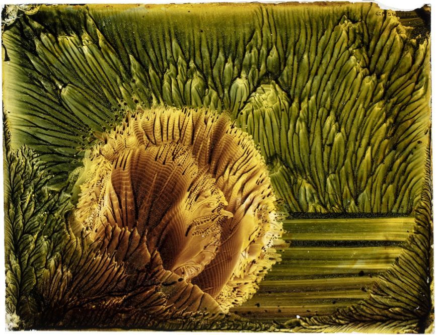 而在那個世紀末,另一位女性以自己發明的機器將這個美麗的佳話繼續,雖然並不為很多人所知,但瑪格麗特·瓦茨·休斯不該被從聲音科學的這段歷史中抹去。當然,她也有將自己的實驗和發現出版出來,是一本叫做The Eidophone的小冊子,幸有此舉,使得我們還能看到當年那些令人驚歎的**“花形”。**它們的原型則已經成為玻璃上的藝術品,經過現代手段的修復,被放置在美術館裏,簡直帶上了一股神聖靈光。