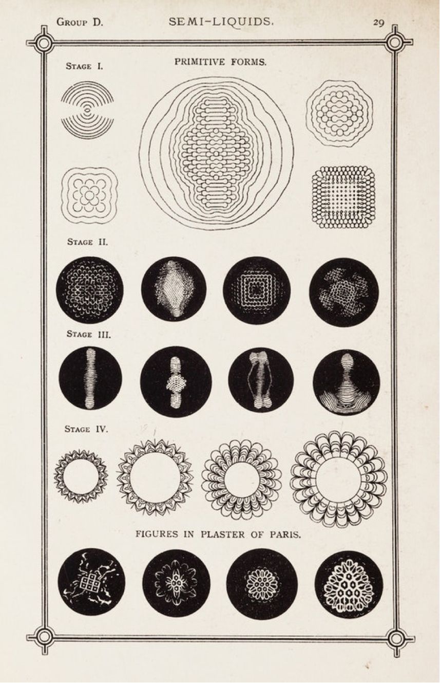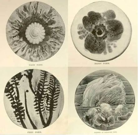 通過實驗不同表面,不同液體,不同頻率的聲音,瑪格麗特創造了很多圖形,她把它們叫做雛菊、三色堇、蛇形、蕨類……在演講中,她不僅給聽眾們展示了這些圖片,還仔細地分析了它們各自的產生條件,其中很多都揭示了聲學中的重要規律,她也希望有更專業的學科知識來對此加以解釋。