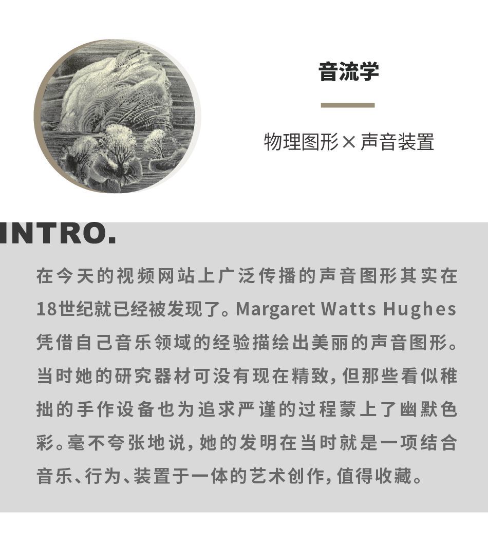 從各種意義上來説,瑪格麗特·瓦茨·休斯(Margaret Watts Hughes)都是一位足夠傳奇的人物,堪稱他們那個時代的海蒂·拉瑪(Hedy Lamarr),橫跨娛樂和科學兩界。她的真實身份是一位威爾士歌手兼作曲家,卻在演唱之餘發明了一種裝置,用來進行聲音共振實驗並對這種現象加以觀察,把聲音產生的幾何圖案展現、記錄下來。一百多年前的非凡夜晚,在皇家學會的晚會上,面對台下黑壓壓一片帶着好奇和挑釁目光的紳士們,瑪格麗特開始介紹自己拍下來的那些“聲音圖形”(Voice-Figures)。