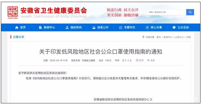 據安徽省衞生健康委員會官網,16日,安徽省發佈《低風險地區社會公眾口罩使用指南》。