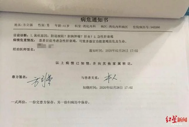 2月28日,因看到普仁醫院發佈可住院信息,我丈夫終於被該院收治。就在我以為終於等到希望的時候,當天就收到醫院出具的病危通知書,即告知其醫院條件有限,要求我們儘快轉院至大醫院治療。