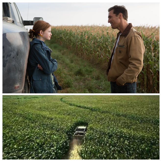 但你能想象嗎,為了拍攝男主一家開着皮卡略過玉米地的場景,諾蘭竟然僱人種植了500畝玉米,對就是這個場景: