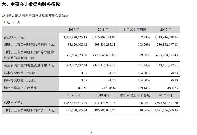 值得一提的是,在宣佈申請50億元的授信業務之後,*ST安凱發佈了2019年業績報告稱,該公司實現營業收入約為33.76億元,同比增長7.28%;實現歸屬於上市公司股東的淨利潤約為0.34億元,同比增長103.76%,實現扭虧為盈。基本每股收益為0.05元/股。