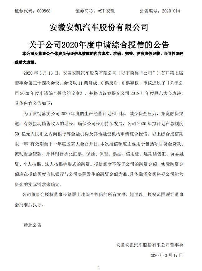 3月16日,*ST安凱發佈公告稱,擬在總額度50億元之內向銀行等金融機構及其他融資機構申請綜合授信。