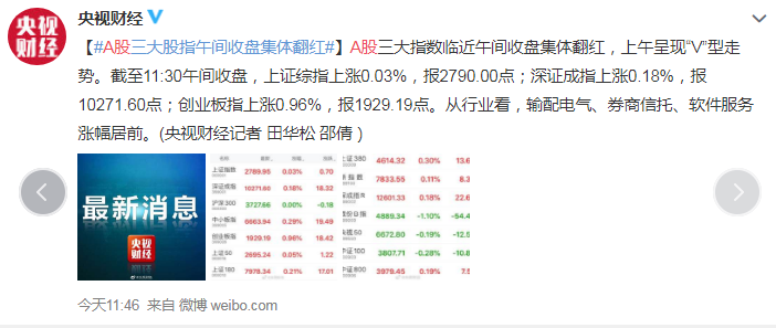截至午間收盤,三大股指全部翻紅:上證指數漲0.74點,漲幅0.03%,報2790.00點;深證成指漲18.31點,漲幅0.18%,報10271.60點;創業板指漲18.43點,漲幅0.96%,報1929.19點。
